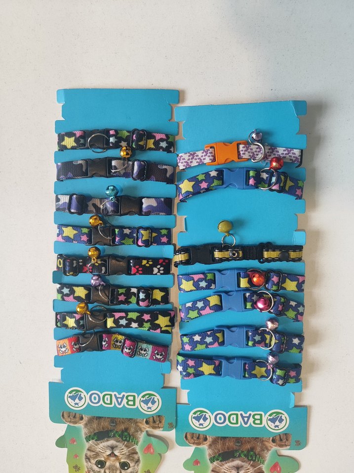 Yıldız ve desenli renkli kedi tasması. Ayarlanabilir ve şık.