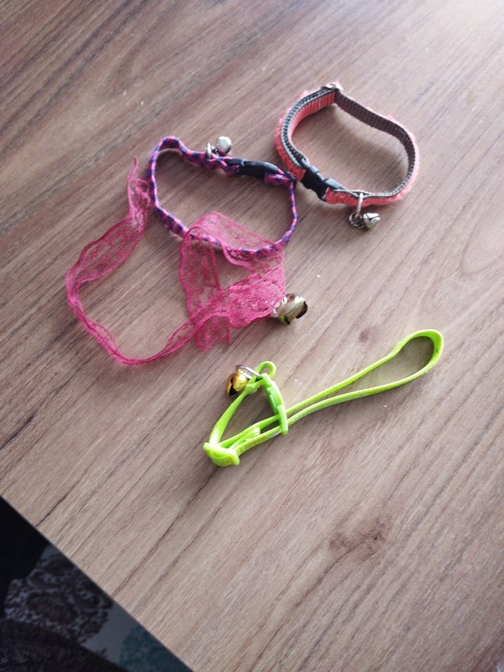 Renkli Kedi Tasması Seti Küçük çanlı, pembe dantel ve neon yeşil renklerde üç renkli kedi tasması seti .4 adet kedi tasması