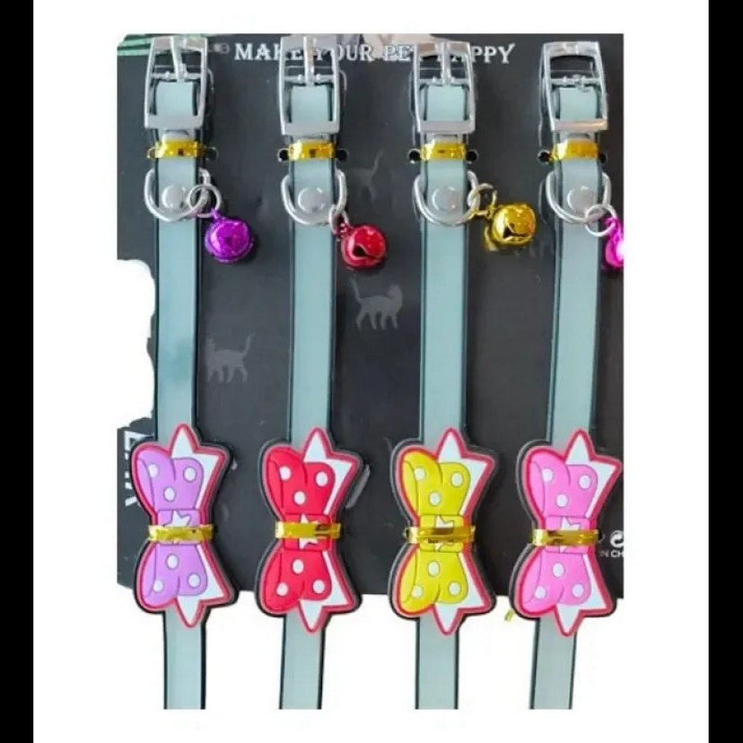 Farklı renklerde fiyonk desenli kedi tasması ve çan seti. Her tasma tokalı ve etiket halkalıdır.