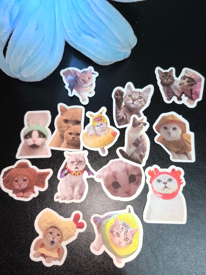 Farklı kedi ifadeleri ve kostümleri içeren renkli kedi çıkartmaları, kişisel eşyalarınızı süslemek için uygun.
