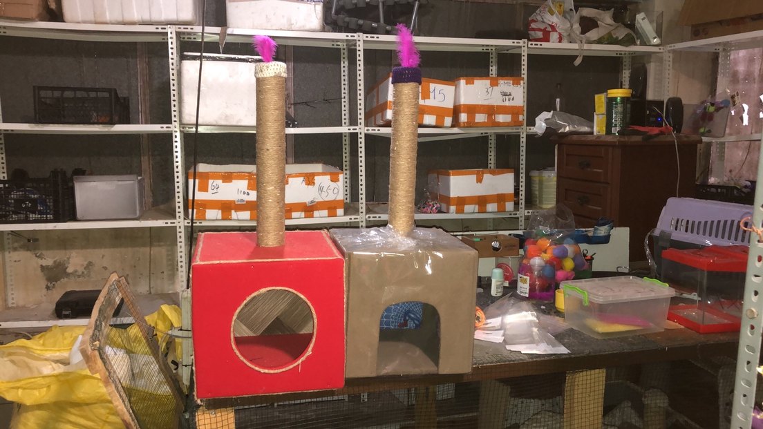 Renkli tüy oyuncaklı kedi tırmalama direkleri ve kırmızı ile doğal tonlarda saklanma alanları.