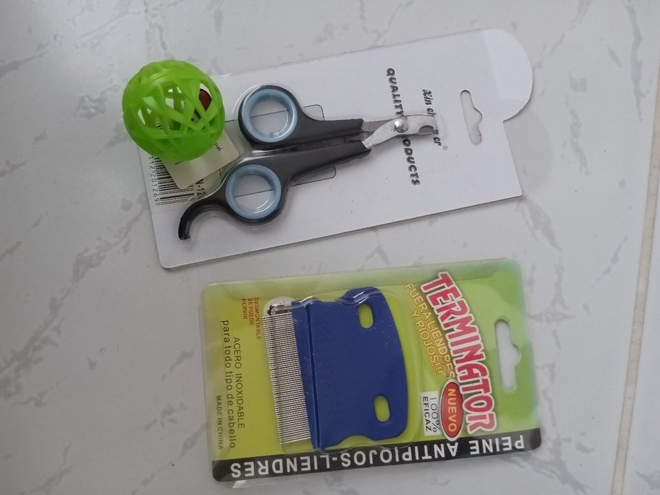 Renkli kedi tırnak makası ve paslanmaz çelik mavi pire tarağı içeren bakım seti.