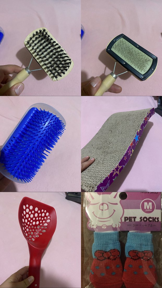 Renkli kedi tüy fırçaları, tırmalama pedi, kum küreği ve pet çoraplar içeren bakım ve oyuncak seti.