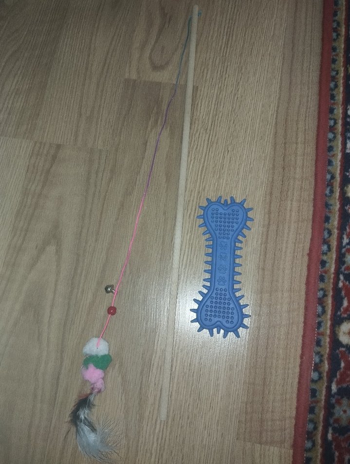 Renkli tüylü olta( oltanın tüyü kopmuştu ama diktim sorun yok) ve tırtıklı oyuncak kemik