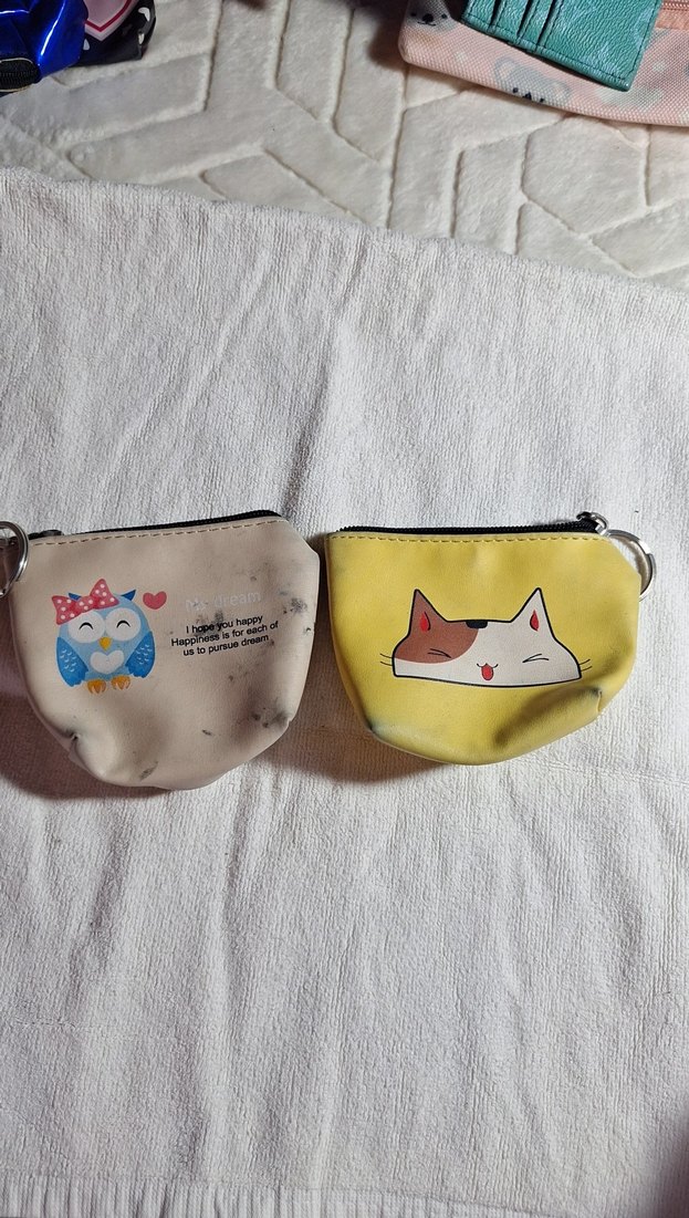 Sevimli kedi ve baykuş desenli, küçük eşyalar için renkli iki mini cüzdan. Biri sarı, diğeri bej renkte.