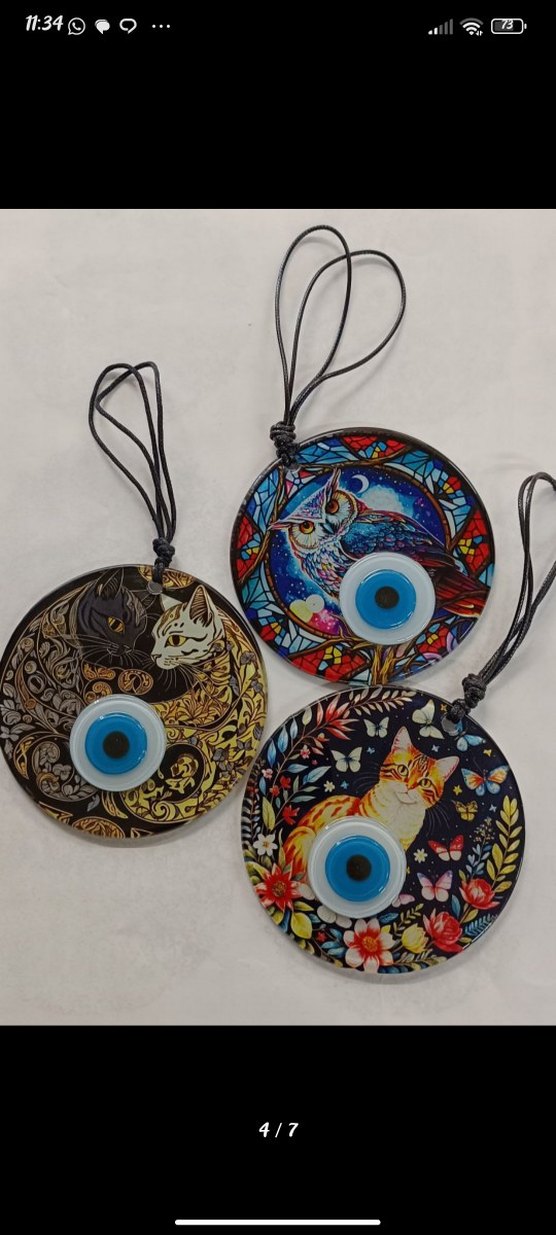 Renkli kedi ve baykuş desenli, ortasında mavi nazar boncuğu bulunan yuvarlak dekorlar, asmak için uygun.