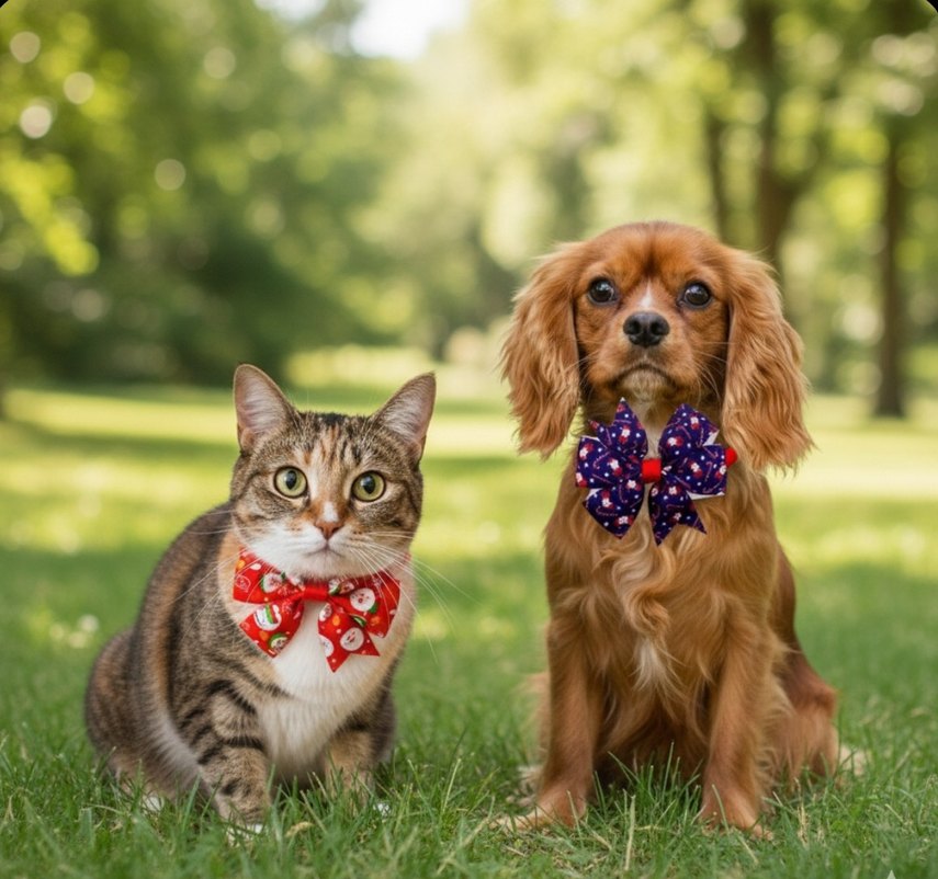 Kediler ve köpekler için tasarlanmış renkli papyonlar, evcil hayvan aksesuarlarına neşeli bir dokunuş katıyor.