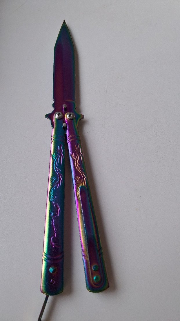 Çok renkli, işlemeli saplı kelebek bıçağı, şık ve işlevsel bir üründür.