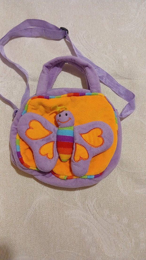 Yumuşak kumaştan, kelebek desenli ve ayarlanabilir askılı renkli çocuk çantası.