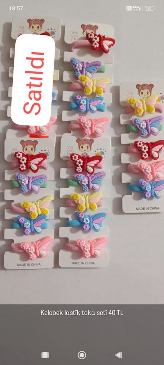 Çocuklar için kelebek şekilli, çiçek desenli ve kurdele detaylı renkli saç tokaları. Çin'de üretilmiştir.