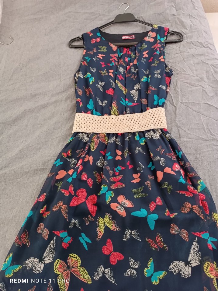 Renkli kelebek desenli, kemerli ve kolsuz elbise. Sentetik kumaştan, günlük kullanıma uygun.