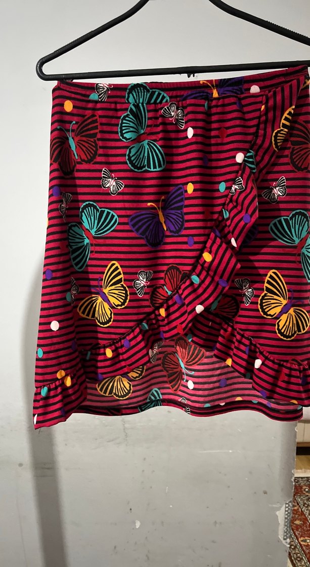 Renkli Kelebek Desenli Pilili Midi Etek