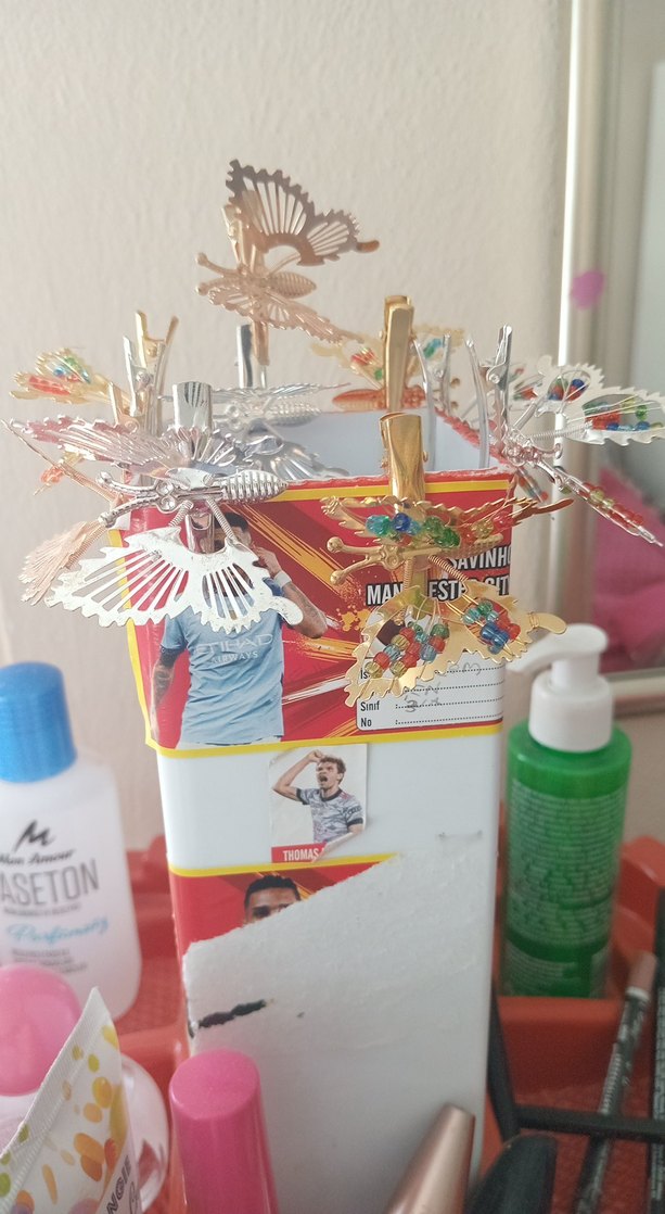 Detaylı desenlere sahip renkli kelebek şeklinde mandallar içeren set. Bazılarında küçük boncuk süslemeleri bulunur.