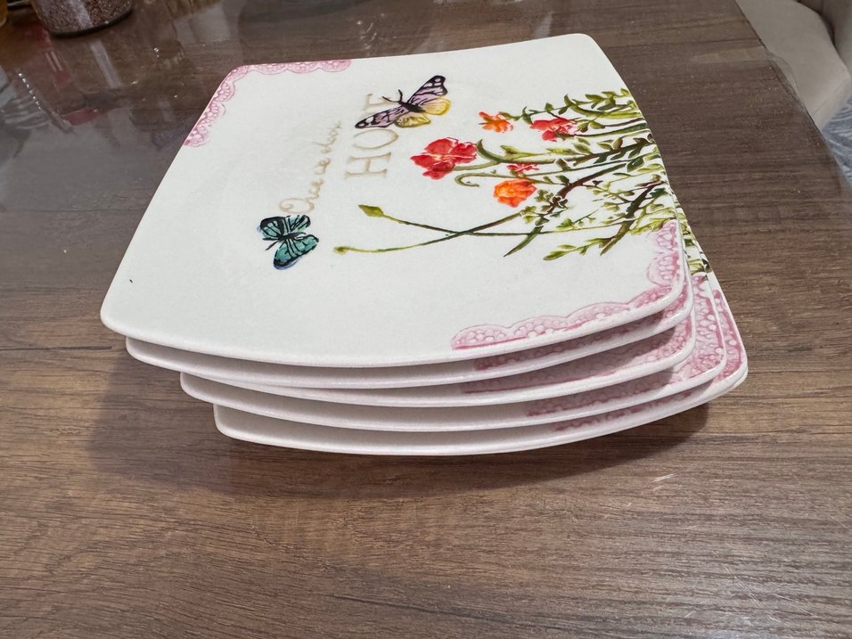 Renkli Kelebekli ve Çiçek Desenli Beyaz Tabak Seti 6 lı
