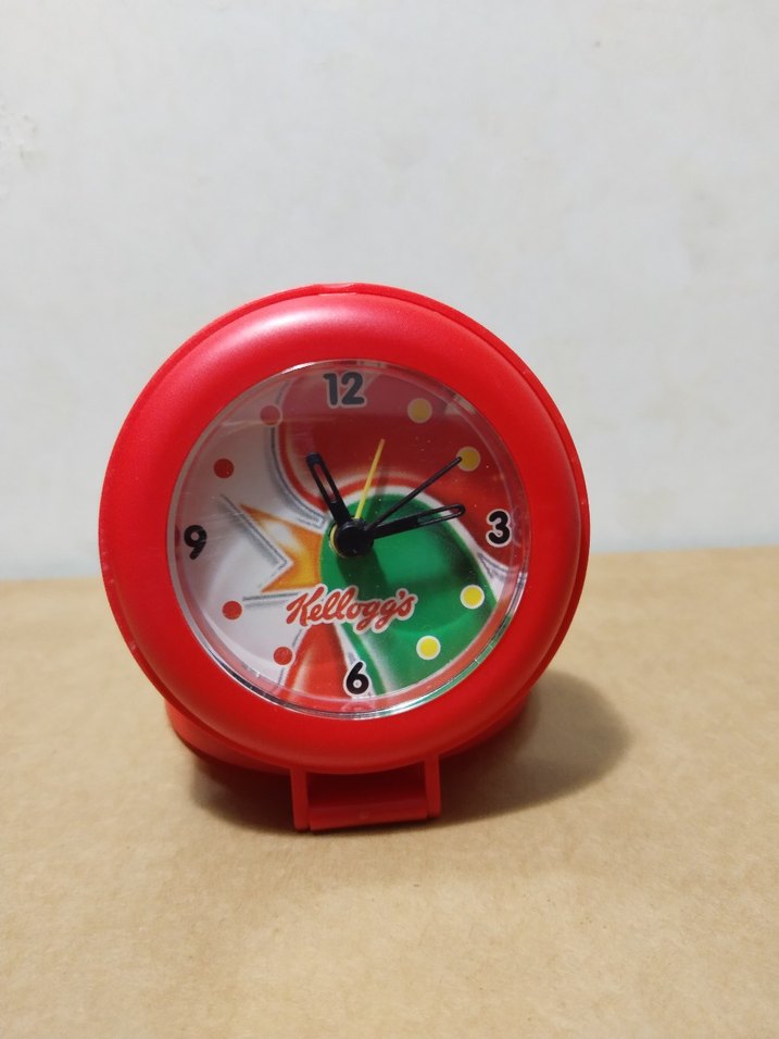 Canlı Kelloggs logosu ve okunması kolay rakamlarıyla renkli kırmızı masa saati. ⏰#retro #vintage #popart #antika