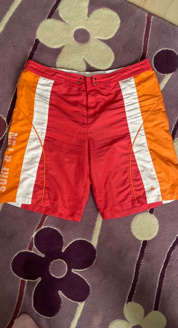 Kemerli ve bol kesim olan bu erkek mini şort, kırmızı, turuncu ve beyaz panellerle renkli bir sokak stili sunar. Plaj için uygundur.