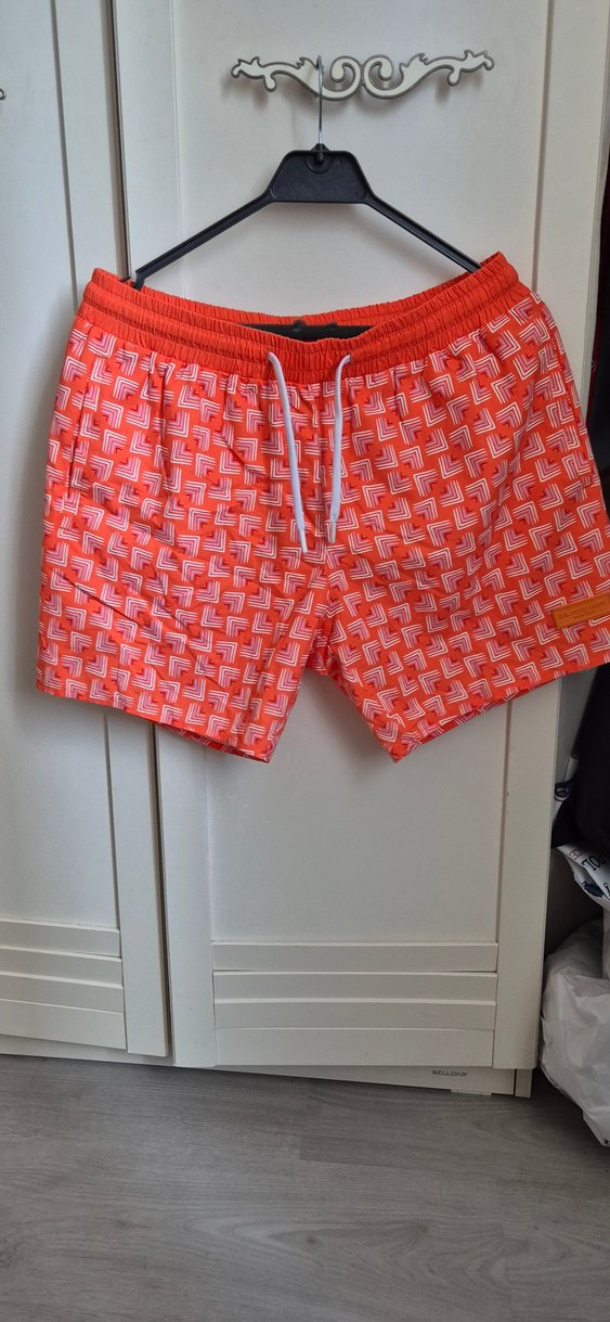 Canlı kırmızı tie-dye desenli, kemerli ve bol kesim erkek mini şort. Plaj ve günlük sokak tarzı için uygundur.