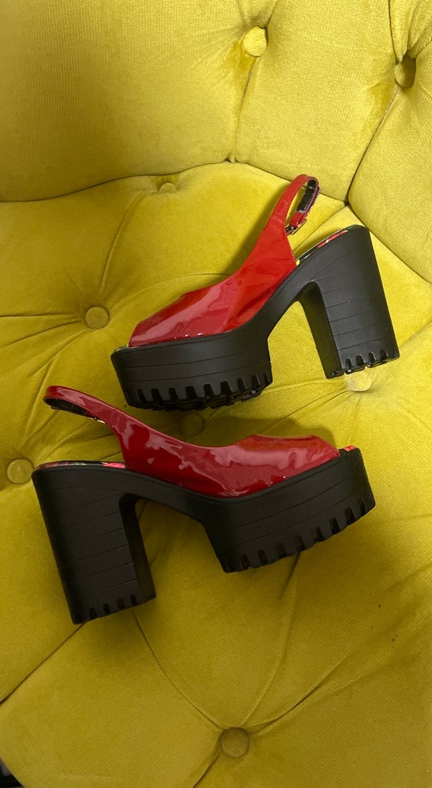 Canlı renkli, kemerli kırmızı platform topuklu ayakkabılar, kalın siyah tabanlı ve desenli tarzıyla romantik akşamlar için uygun.