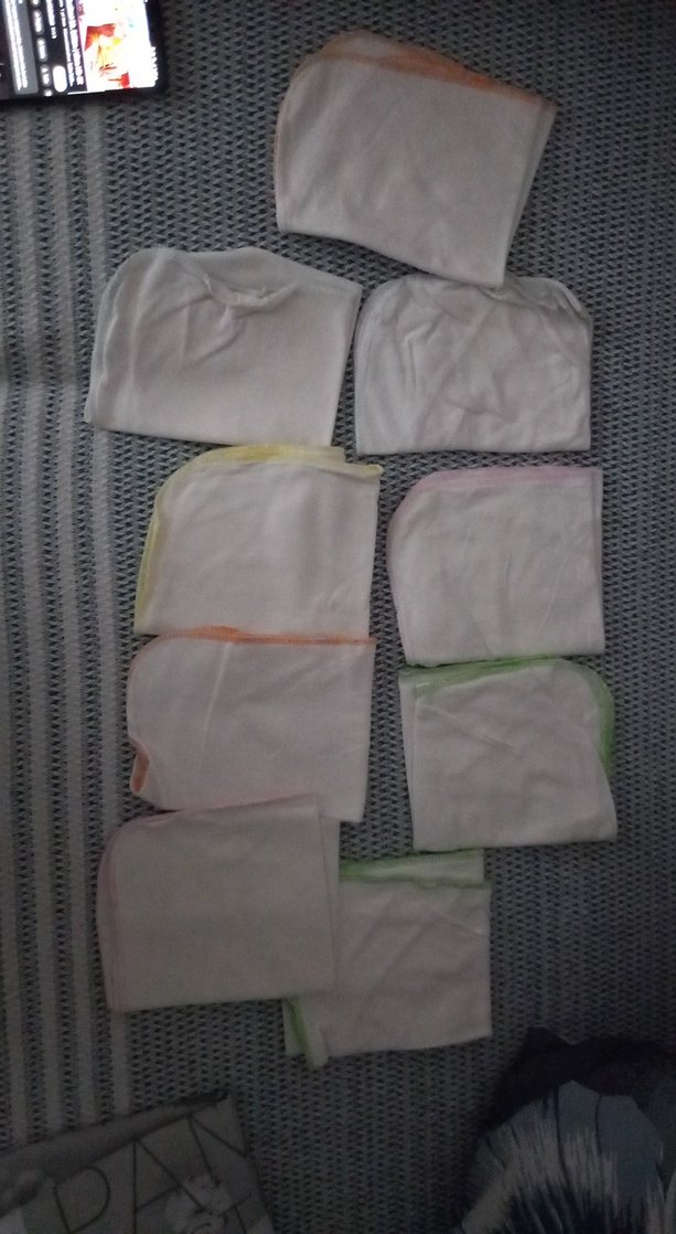 Çeşitli pastel renkte renkli kenarları olan yumuşak bebek bezleri, düzenli şekilde katlanmış ve çizgili bir yüzeye yerleştirilmiştir.