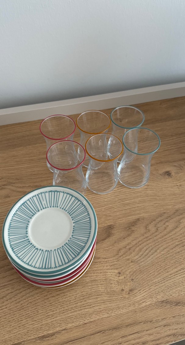 Altı adet renkli kenarlı şeffaf çay bardağı ve çizgili desenli uyumlu tabaklardan oluşan set. Canlı ve açık renkler kullanılmış.