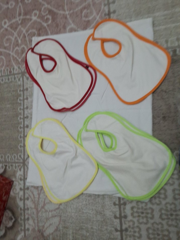 Kırmızı, turuncu, sarı ve yeşil renkli kenarlarla beyaz bebek önlükleri. Yumuşak kumaştan üretilmiştir. 5 tane fiyattır
