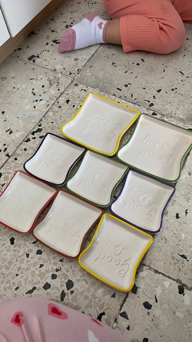 Renkli kenar detaylı, "Good Day" kabartmalı açık renk seramik atıştırmalık tabaklarıdır. Küçük porsiyonlar için uygundur. ️