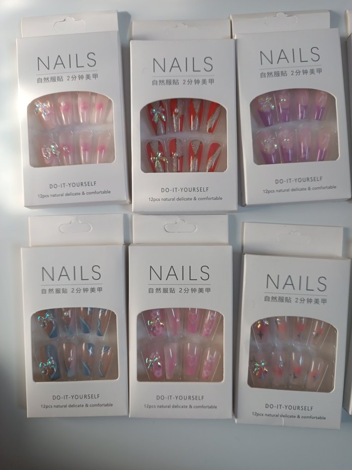 Her pakette 12 adet bulunan renkli kendin yap tırnak süslemeleri, doğal görünümlü ve rahat tasarımlara sahiptir. takma tırnak
