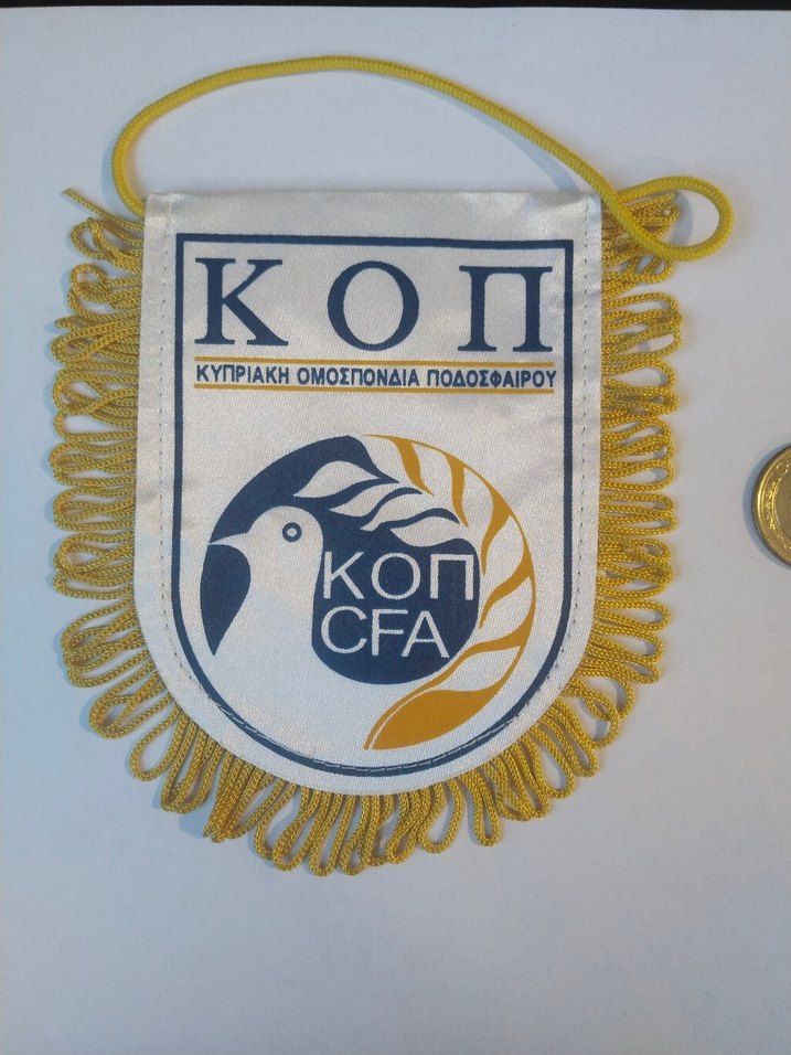 Kıbrıs Futbol Federasyonu'nun Yunan alfabesiyle yazılmış amblemi ve kuş simgesi yer alıyor, sarı püsküllerle çevrili. ⚽