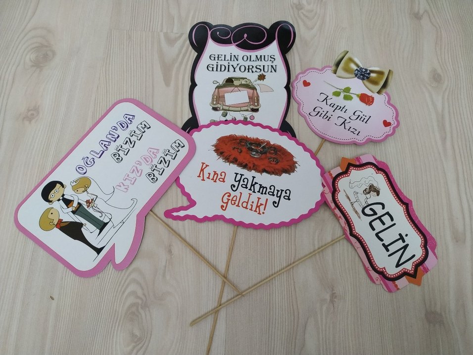 Renkli pembe kına gecesi için Türkçe yazılı eğlenceli parti konuşma balonları. Fotoğraf çekimlerinde kullanılabilir. Yeni ve temizdir.