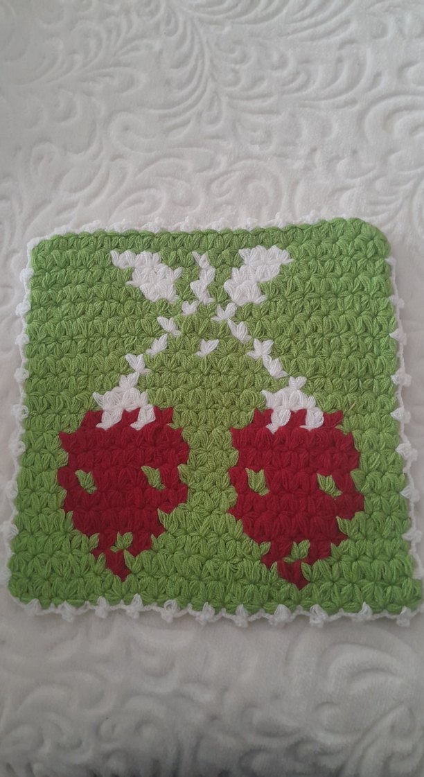 Yeşil zemin üzerine kırmızı kiraz deseni ve beyaz detaylar bulunan renkli, dokulu ve yumuşak banyo süngeri.