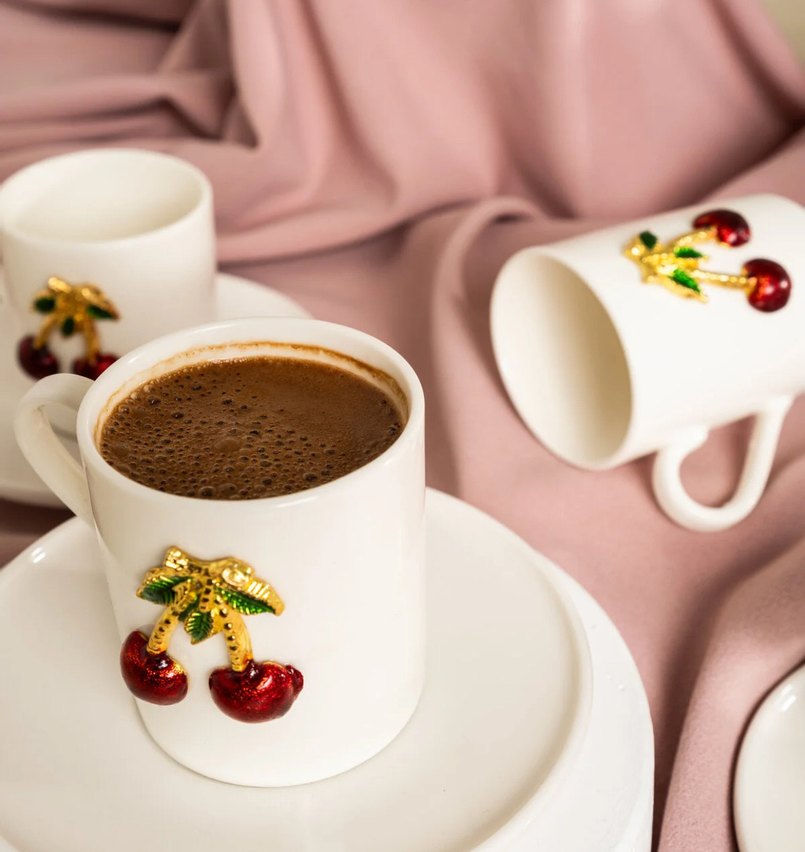 Renkli kiraz detaylarıyla süslenmiş beyaz seramik kupa, sıcak içecekler için uygundur.