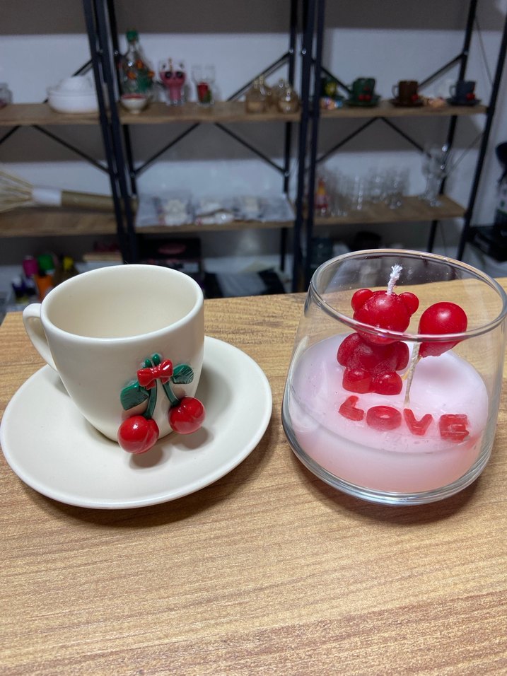 Renkli kiraz süslemeli beyaz fincan ile kırmızı kalp figürlü LOVE yazılı mum, ortama sıcaklık ve şıklık katıyor.
