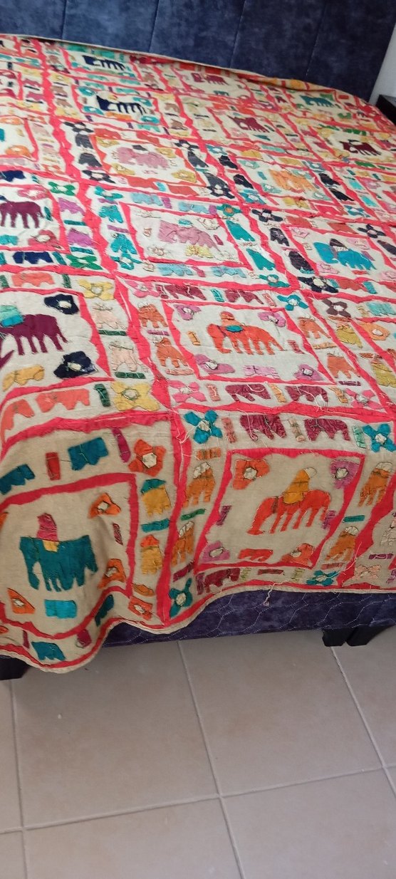 Yumuşak tekstil malzemeden yapılmış, canlı hayvan desenleriyle elde dikilmiş büyük boy yatak örtüsü ebatları 2 metreye, 2.40