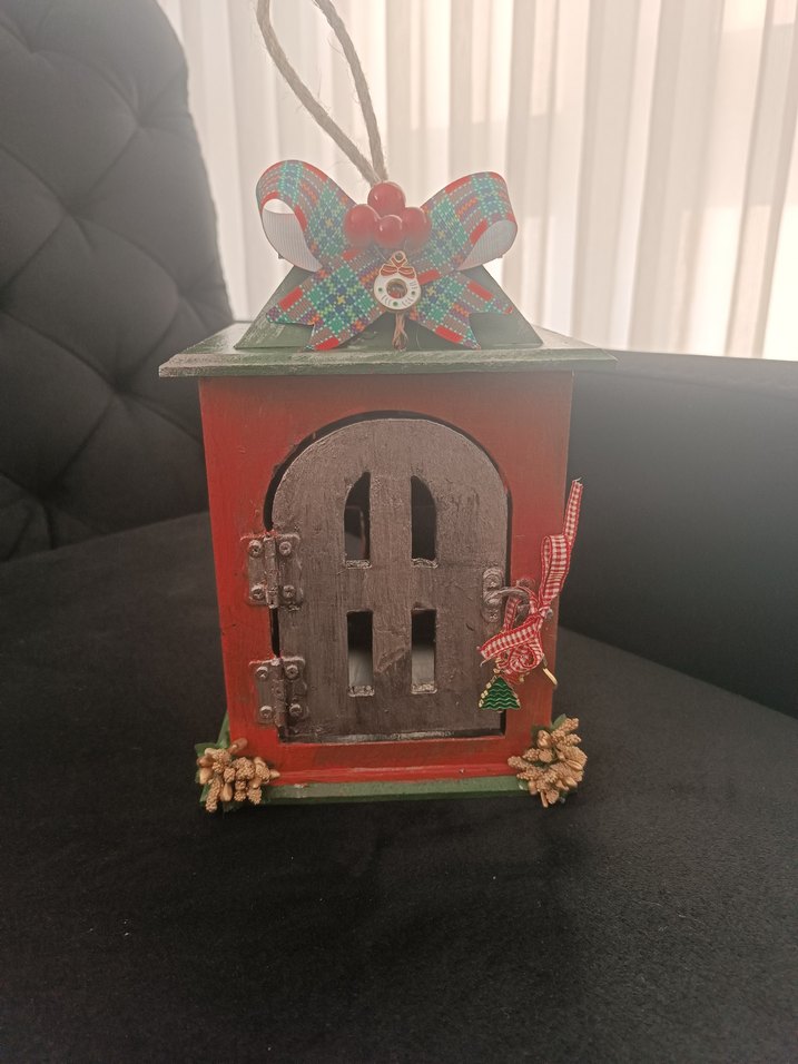 Küçük kapaklı, metal menteşeli renkli kırmızı ahşap mumluk. Dekoratif kurdeleler ve kozalak süslemeleri bulunur, asma ipiyle kolayca asılır. ️