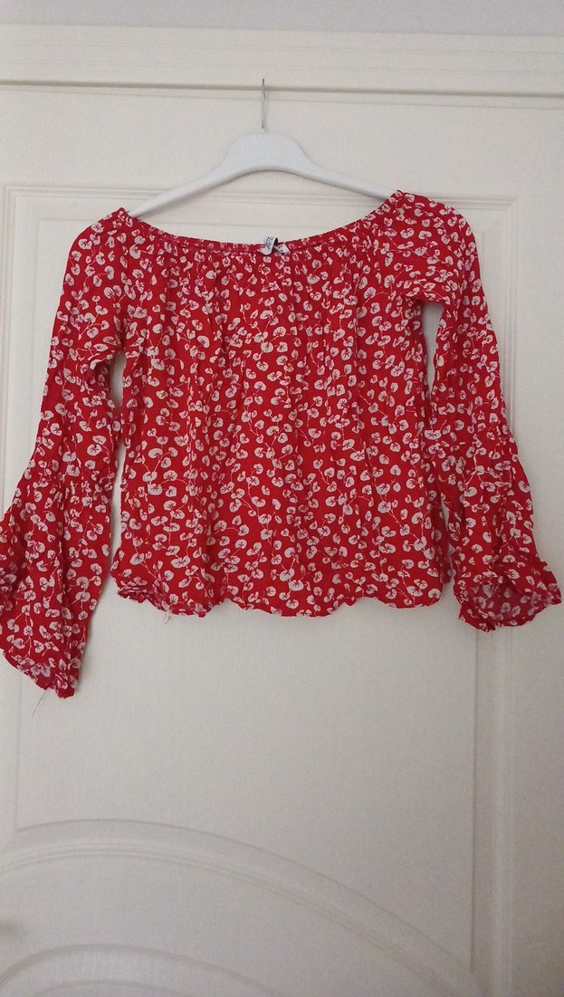 Renkli kırmızı, uzun kollu, düğmeli ve kayık yaka bohem tarzı bluz. Pamuk kumaştan, bağlama deseniyle, bol kesim ve kısa boyda.