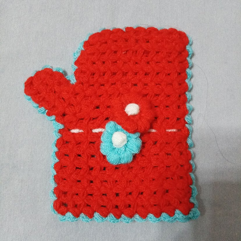 Mavi detaylı, çiçek süslemeli, renkli kırmızı örgü banyo süngeri, nazik temizlik için uygundur.