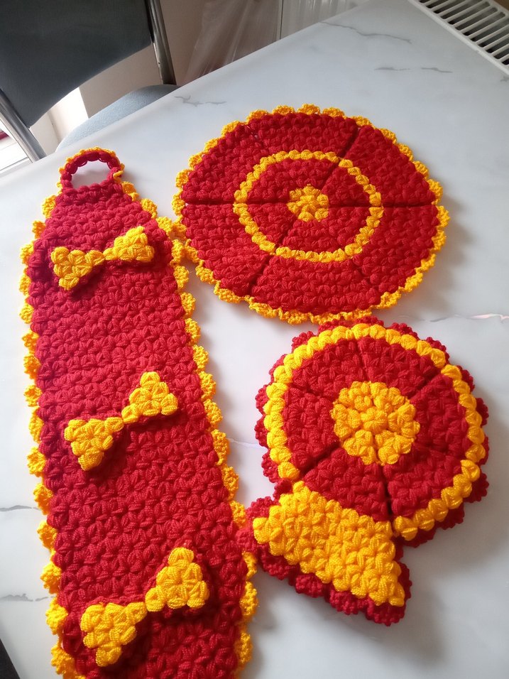 Kırmızı ve sarı renklerde, dokulu yüzeyli ve süslemeli üç parçalı renkli banyo süngeri seti.