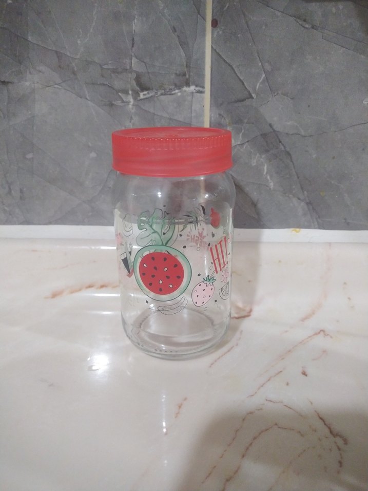 Renkli kırmızı kapağa ve meyve desenlerine sahip şeffaf bebek biberonu, beslenme için uygundur .