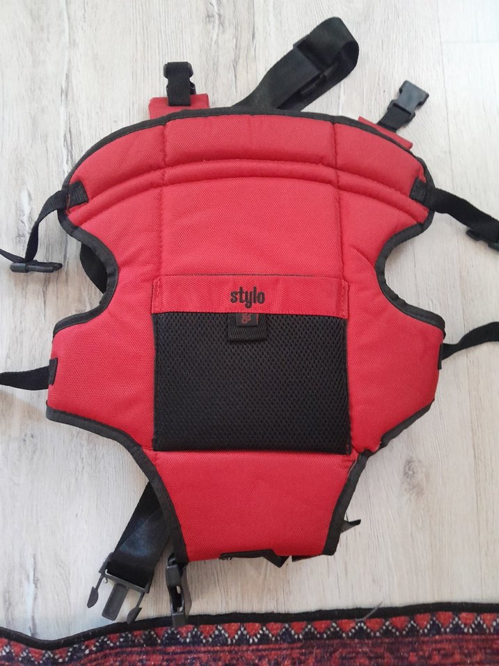 Renkli kırmızı dolgulu askılar ve destekleyici siyah tabanlı bebek taşıyıcıdır. Ayarlanabilir tokalar güvenli kullanım sağlar.