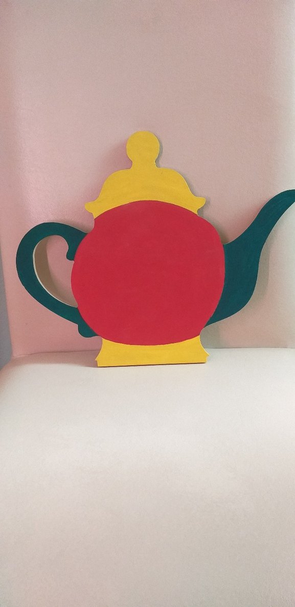 Kırmızı gövde, sarı ve koyu yeşil detaylara sahip renkli çaydanlık dekoru, mekana canlılık katar.