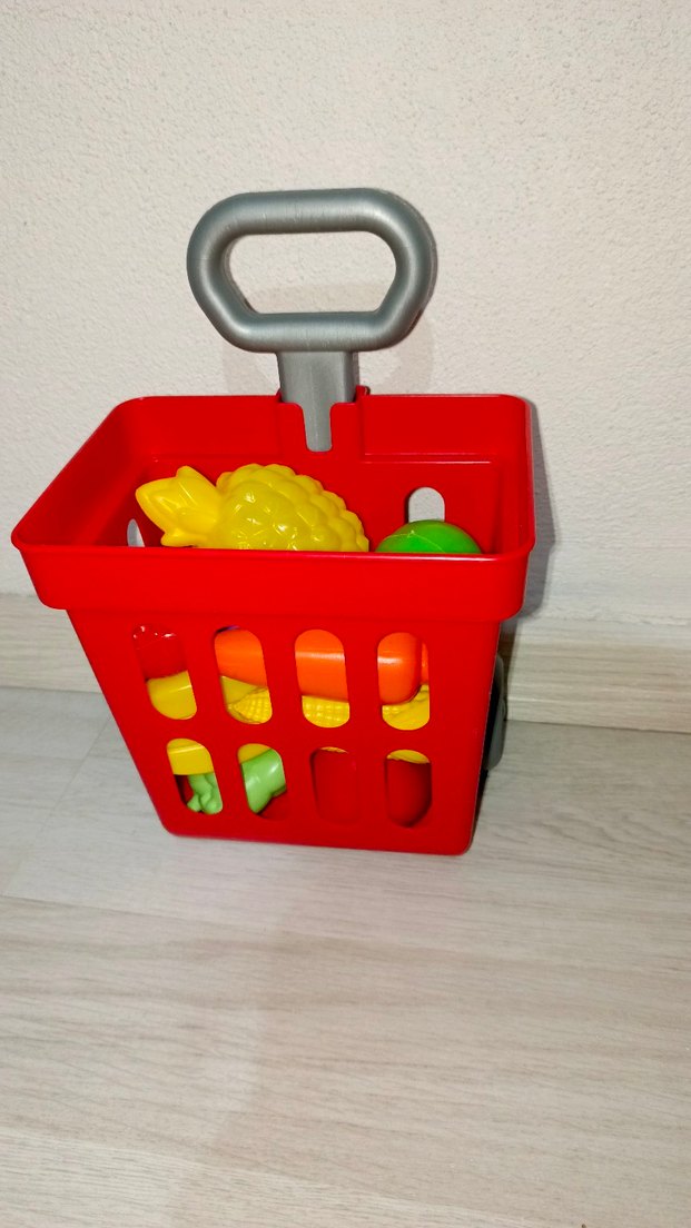Renkli kırmızı çekmeli oyuncak sepet, saplı ve içinde çeşitli meyve şeklinde oyuncaklar bulunur. Oyun ve motor becerilerini destekler.