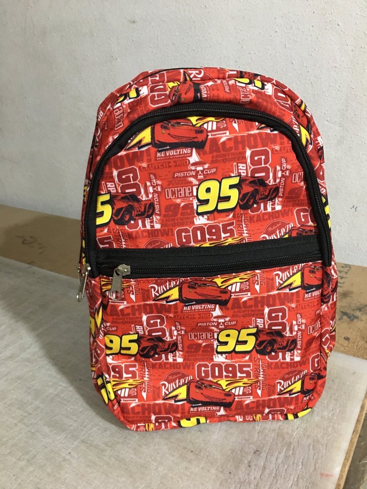 İki bölmeli önde küçük bi bölme Çoklu fermuarlı bölmeleri olan, 95 numara ve yarış arabası desenli renkli kırmızı çocuk okul çantası.