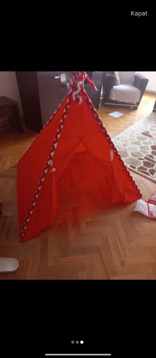 Renkli kırmızı renkte, üçgen yapılı çocuk oyun çadırı. İç mekan kullanımı için uygun, hayal gücünü destekleyen bir alan sağlar. ️