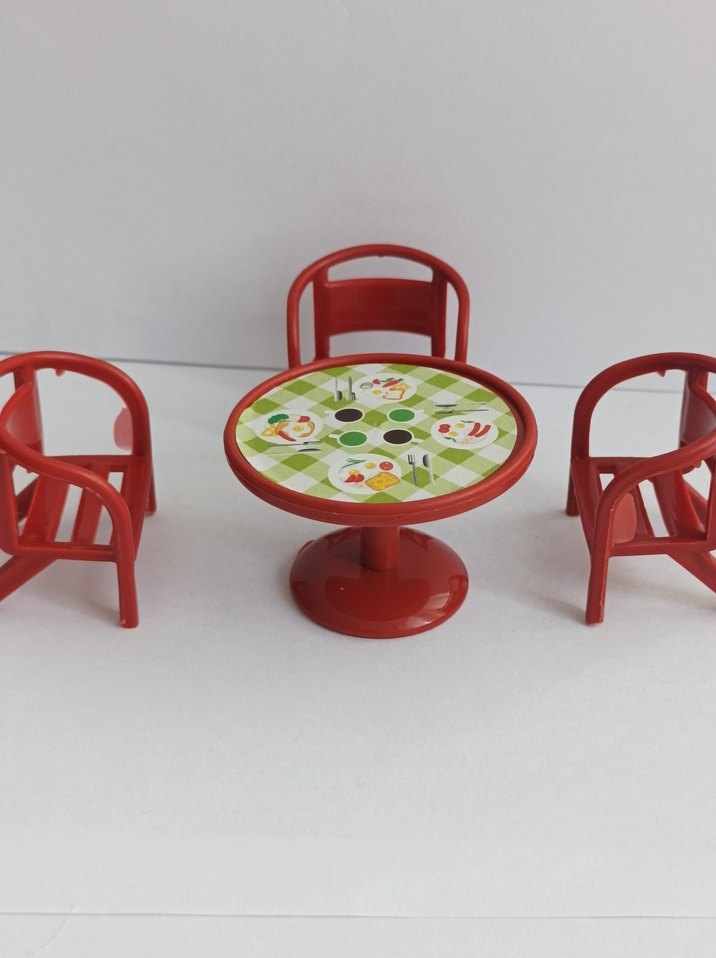 Yemek desenli yuvarlak masa ve üç uyumlu kırmızı çocuk oyun sandalyesi seti. ️