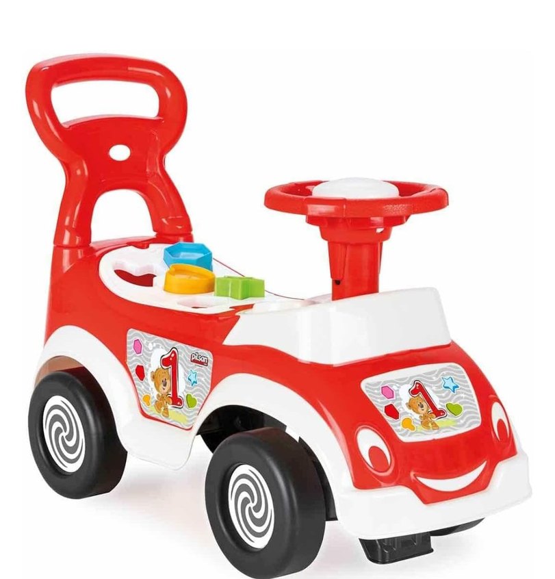Renkli kırmızı oyuncak araba, direksiyon ve eğlenceli tasarım detaylarına sahiptir, çocuklar için uygundur.