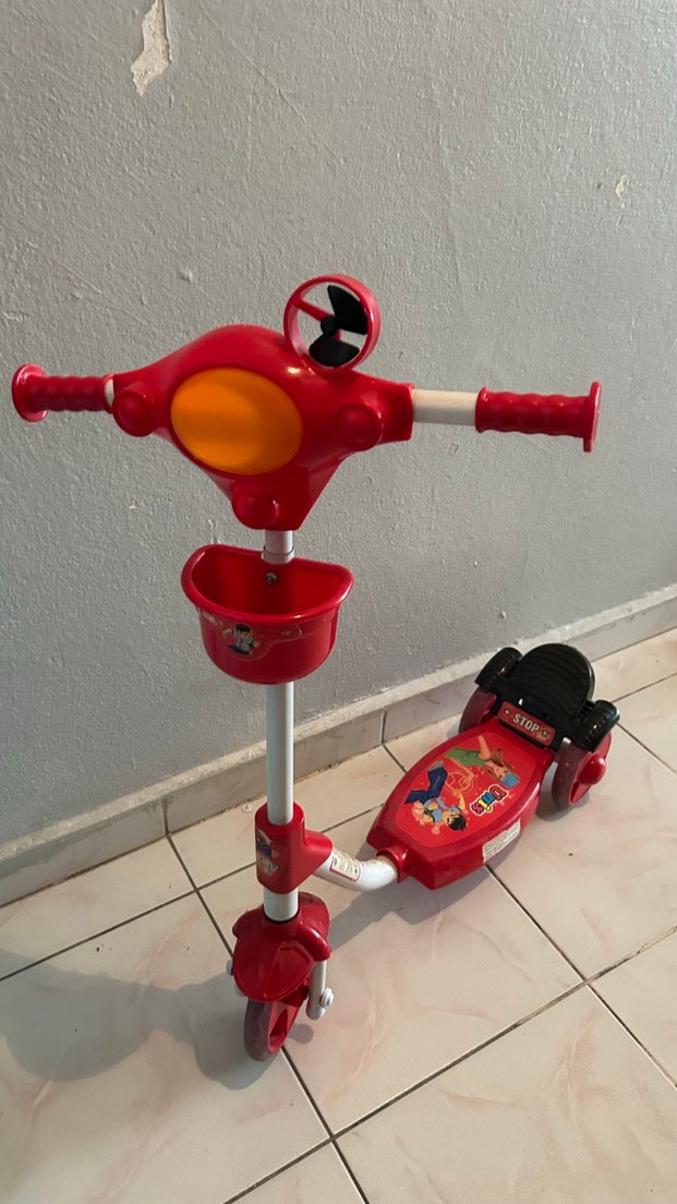 Renkli kırmızı çocuk scooterı, direksiyonda vantilatör, tutma kolları ve önünde küçük sepet içerir.