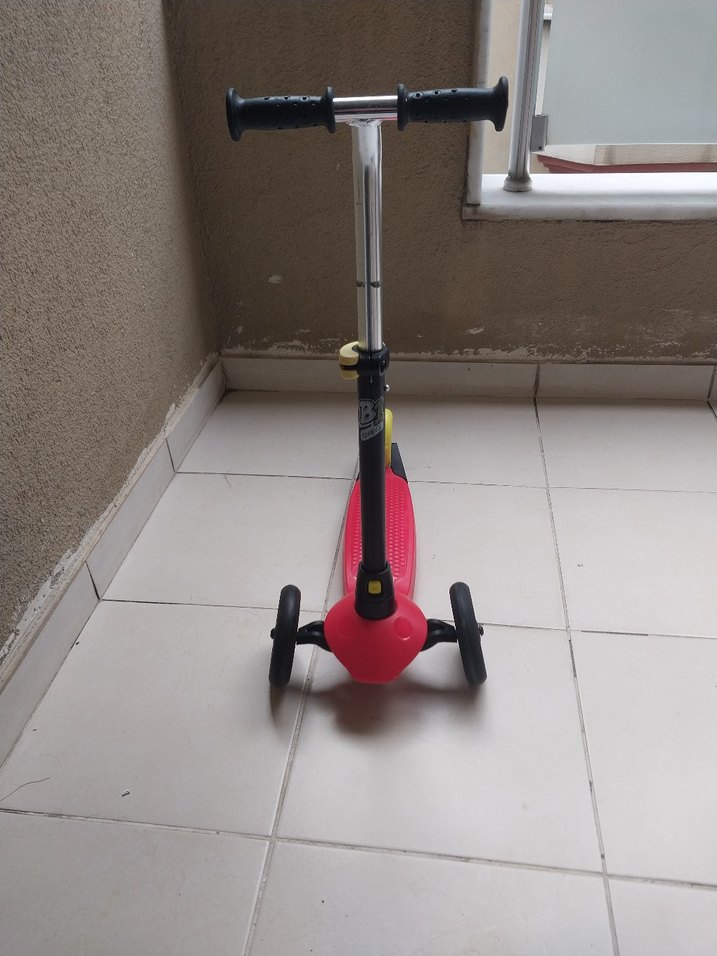 Renkli kırmızı çocuk scooterı, üç tekerlekli dayanıklı yapıya ve rahat siyah tutacaklara sahiptir. sağlam sorunsuz
