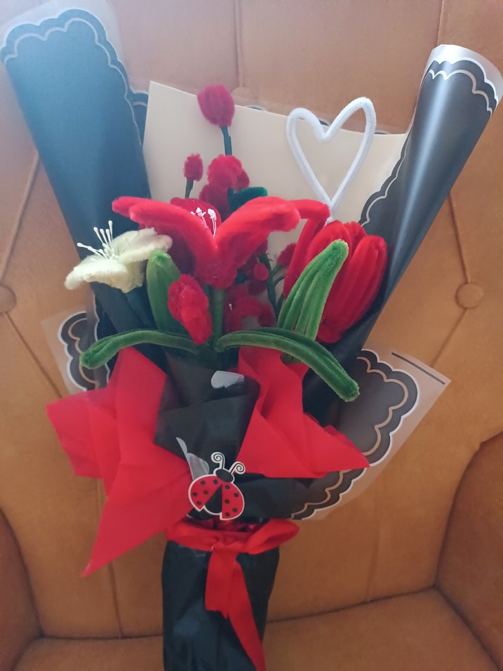 Renkli kırmızı ve yeşil detaylara sahip, kalp şekilli süslemeli ve uğur böceği detayıyla siyah-kırmızı kağıda sarılı dekoratif hediye buketi.