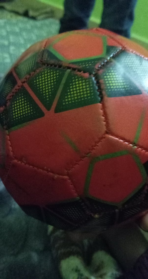 Yeşil ve sarı detaylara sahip renkli kırmızı futbol topu, çeşitli oyunlar için uygundur. ⚽
