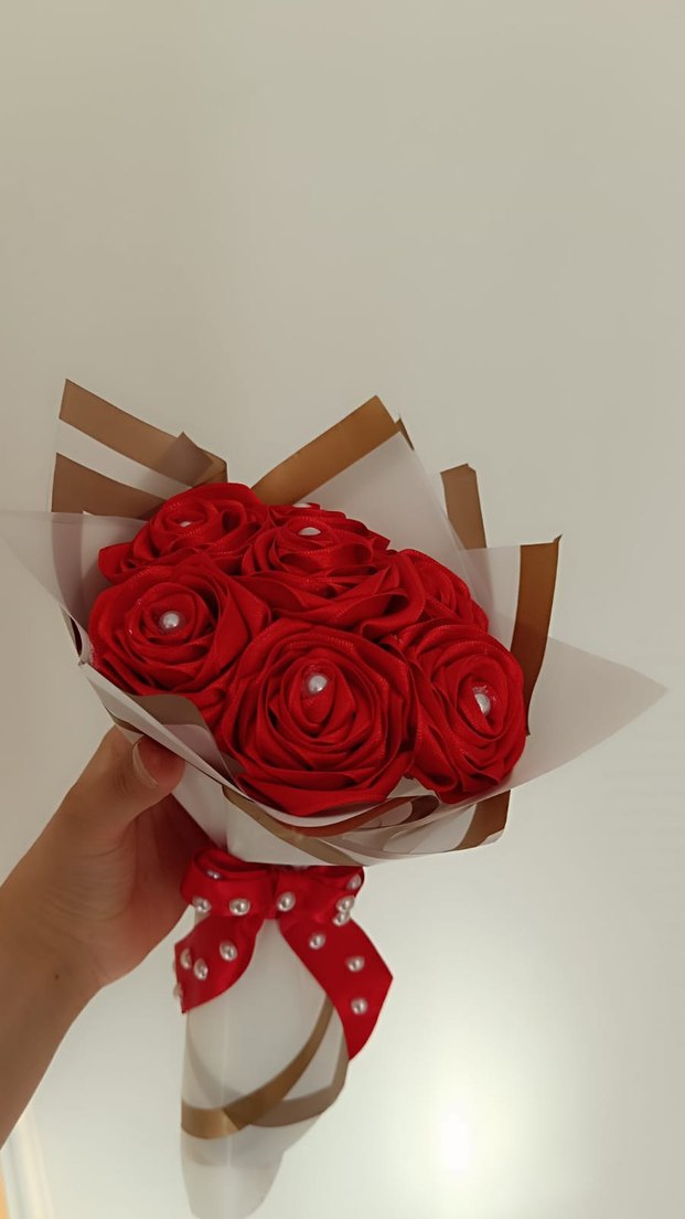 Canlı kırmızı çiçek desenleri ve kurdele detaylarına sahip yapay gül buketi, düğünler veya özel günler için uygundur. Minimalist ve bohem tarzda renkli bir dokunuş sunar.